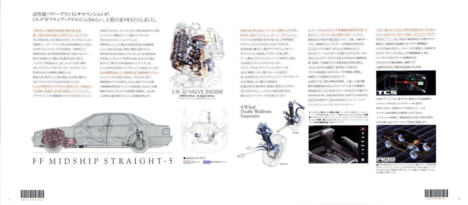 1989年にホンダから発売された初代インスパイア(CB5/CC2/CC3型)です。正確に言うと、1989年に発売されたのは5ナンバーサイズのアコード・インスパイア(CB5型)で、1992年に当時の3ナンバーブームに乗り遅れないようにワイドボディ版(CC2/CC3型)が追加されました。そしてワイドボディ版が登場したときには車名から“アコード”が取れ、ホンダ・インスパイアとなりました。このカタログは1992年に登場したワイドボディ版のインスパイア(CC2/CC3型)のものです。 さて、この初代インスパイア、成金趣味の下品な高級感ではなく、さりげない高級感を醸し出している端正なスタイリングで、個人的にはとてもカッコいいクルマだと思っていました。と同時に、聞きなれない“直列5気筒エンジン”という言葉を初めて聞き、さらにそれを縦置きして前輪を駆動するというメカニズムにびっくりした記憶があります。技術的な詳しいことはわかりませんが、カタログによると“上級FFとして理想的な前後重量配分を実現”するためにはこの方法がもっとも良かったらしいですね。 この方法は2代目インスパイアにも引き継がれましたが、2代目にはV6搭載車も追加され、以降のインスパイアは全てV6のみになっています。実際のところはどうだったんでしょうね。 直5や縦置きFF云々は別として、歴代インスパイアの中ではこの初代がいちばんカッコよかったと個人的には考えています。5ナンバーのアコード・インスパイアから始まったインスパイアでしたが、代を重ねるごとに他の例にもれず大型化し、現行インスパイアはとんでもなく大きなクルマになりましたね。まあいまさらびっくりはしませんが・・・。 ところで、天皇陛下が御所の中でご自分でご運転されるプライベートの愛車はこのインスパイアと同時期に発売された2代目インテグラの4ドアハードトップだそうですね。クルマ好きで知られる陛下がお選びになられたお車がインスパイアでもレジェンドでもなくインテグラの4ドアハードトップ、それもMTだそうです。以前皇后様を助手席に乗せられてインテグラをご運転されるお姿をテレビで拝見したときにはとても感動しました。(陛下と車については、こちらの記事もご一読ください。) 年々大型化・高級化するクルマには目もくれず、今もインテグラをご運転されておられる陛下は現在のクルマ事情に関してどんなお考えをお持ちになられておられるんでしょうね。お立場上決してご発言されることはないと思いますが、とても興味があります。お体の調子がよろしくないとの報道がありましたのでとても心配です。くれぐれもご無理をされないように、いつまでも美智子様とインテグラでドライブを楽しまれるご状態でいてほしいものですね。 インスパイア・25Xi(CC2型) 全長×全幅×全高 : 4830×1775×1375mm ホイールベース : 2805mm 車両重量 : 1400kg エンジン : 直5SOHC 2451cc 190PS (2011年2月13日記) ![]() (画像クリックで拡大) ![]() (画像クリックで拡大) ![]() (画像クリックで拡大) ![]() (画像クリックで拡大) ![]() (画像クリックで拡大) ![]() (画像クリックで拡大) ![]() (画像クリックで拡大) ![]() (画像クリックで拡大) ![]() (画像クリックで拡大) |