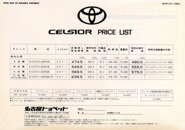 最後にセルシオの価格表を載せました。この価格表について、人によってはいろいろな捉え方があると思いますが、現在この価格で初代セルシオに比肩し得るクルマってありますかね?個人的には、最近の国産高級車の価格設定にはとても疑問を感じています。