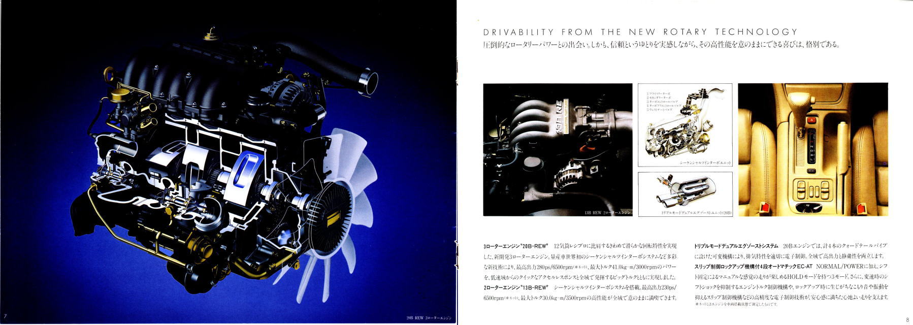 さて、このユーノスコスモ、なんと言っても一番の特徴は3ローターの20B-REWなるツインターボエンジン搭載車の存在ですね。あまりのハイパワーゆえ、市販するには当時の自主規制値であった280PSに収まるようにデチューンしなくてはならなかったほどのエンジンが搭載されたクルマ、私はこのクルマは一度も運転したことがありませんのでどんな運転感覚なのかはわかりませんが、さぞ凄かったことでしょうね。