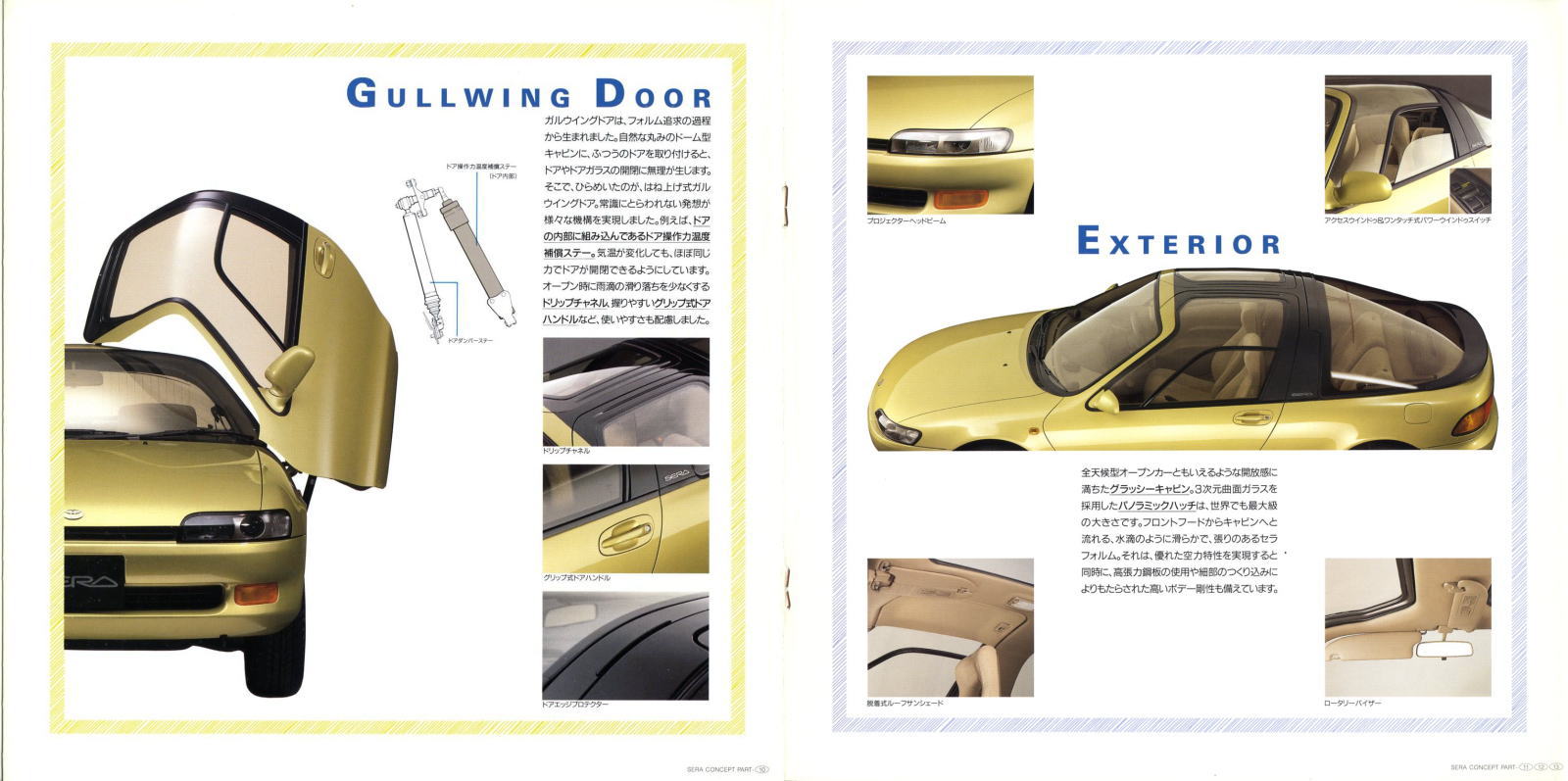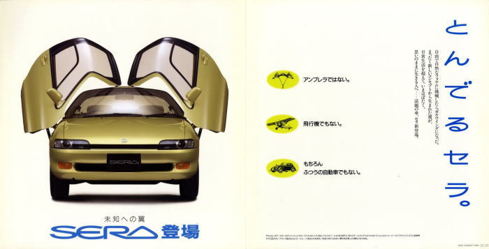 つまりこのクルマ、ガルウィングドアとガラストップが付いたスターレットです。でもこういうクルマっていいですね。高性能エンジン、静粛性、低燃費、高級感、利便性等、それぞれのクルマがあるテーマを基に開発されているわけですが、開発テーマが“ドア”というのは後にも先にもこのセラだけだと思います。