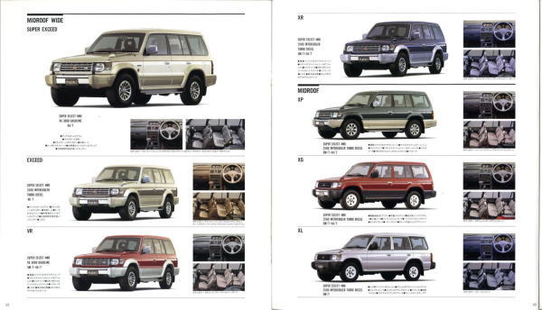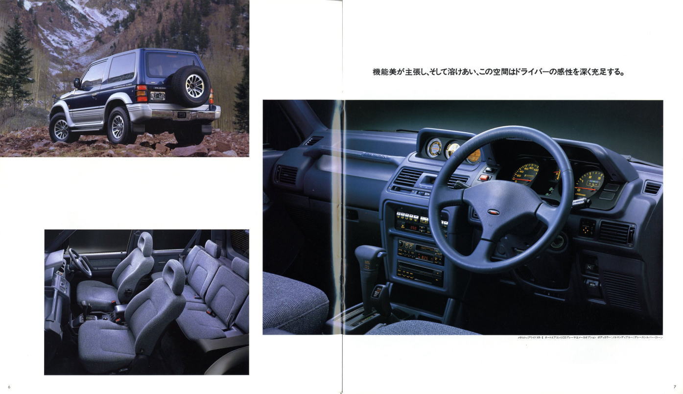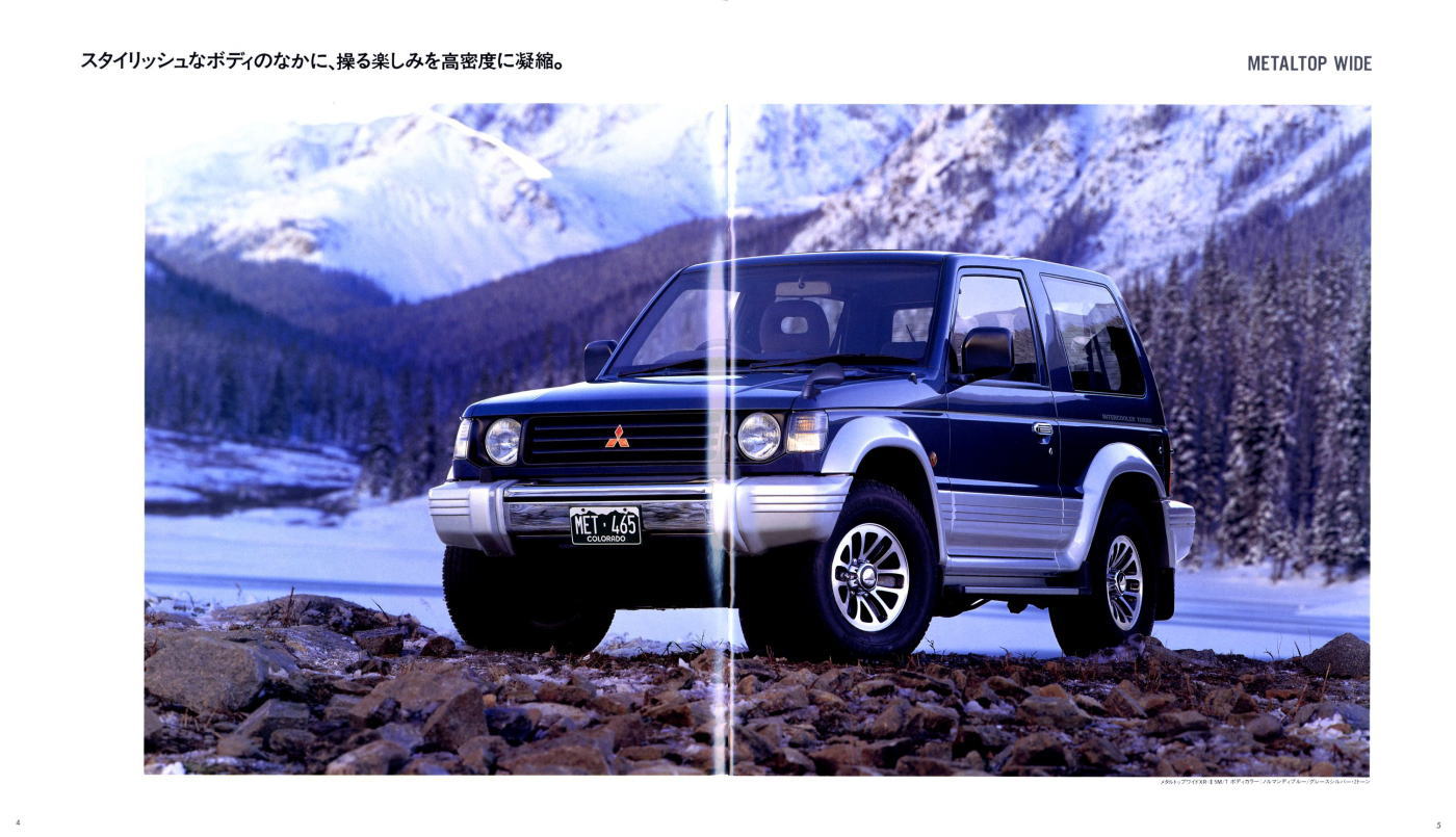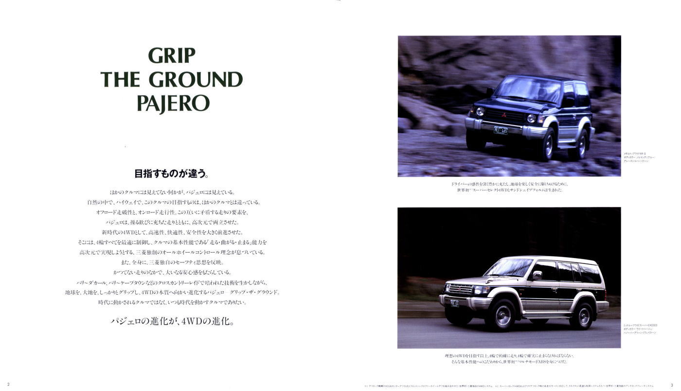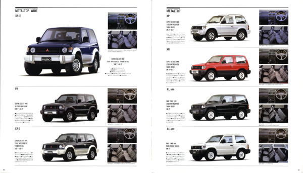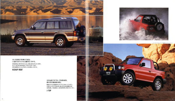 この2代目パジェロ、絶頂期のパジェロだったこともあり、個人的にはやはりパジェロといえば2代目が真っ先に頭に浮かびます。今あらためてこのカタログを見ると、“無骨でごつい男のクルマ”に見えるのですが、当時はこのカタログを見てもハイラックス・サーフ同様、ナンパなクルマにしか見えませんでした。その時々の時代背景によって同じものに対する感じ方もずいぶん変わってくるものですね。ブームに左右されず、現在パジェロを購入されておられる方々は本当のパジェロ・フリークだと思います。冷静に考えれば、この手のクルマが販売台数1位になるなんていうのはちょっと異常なことで、クルマの性質を考えれば現在の比率が自然なんでしょうね。