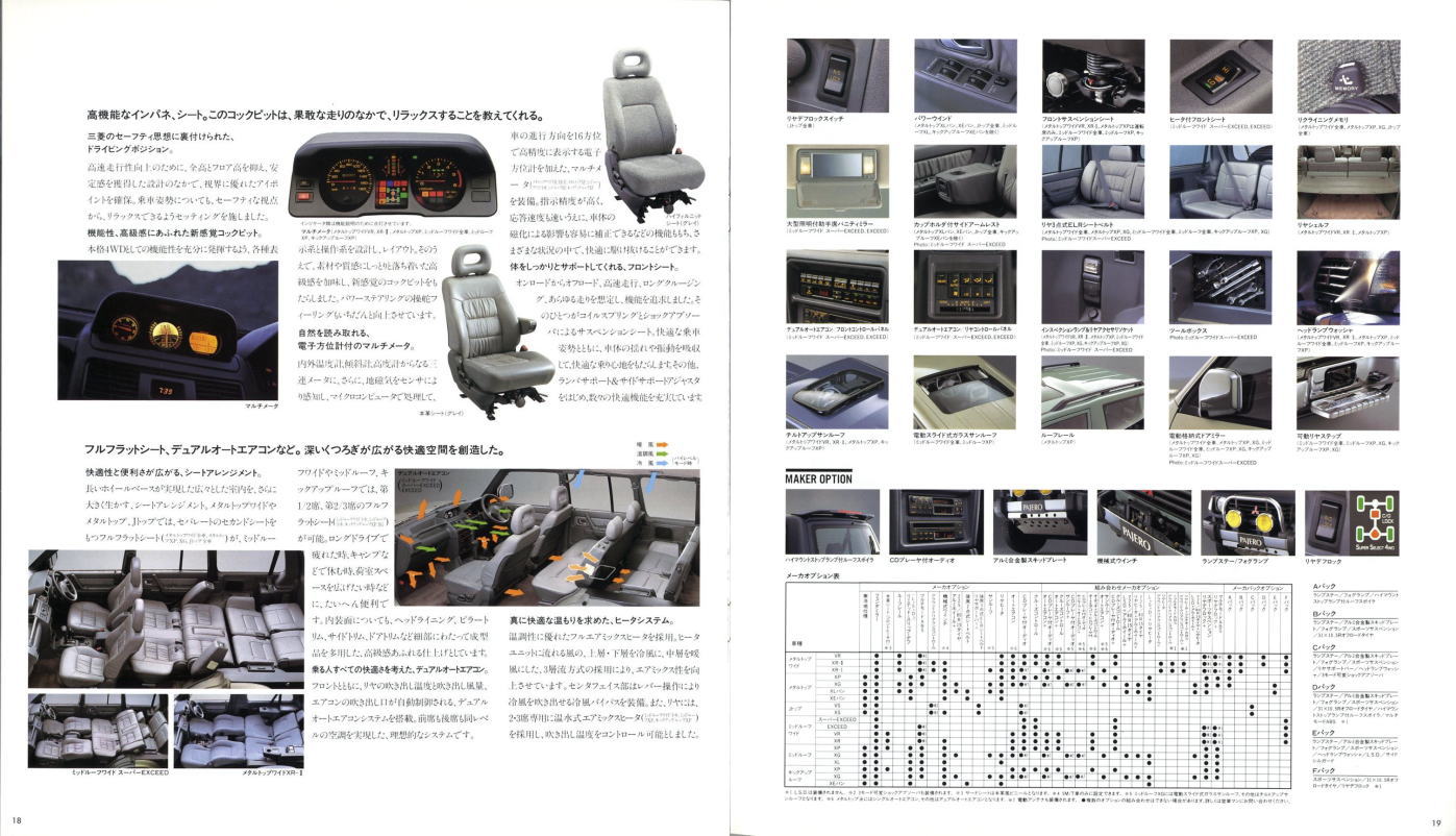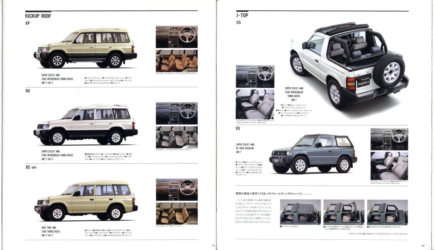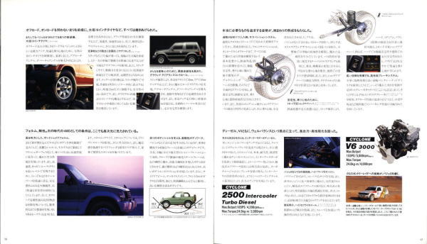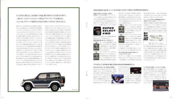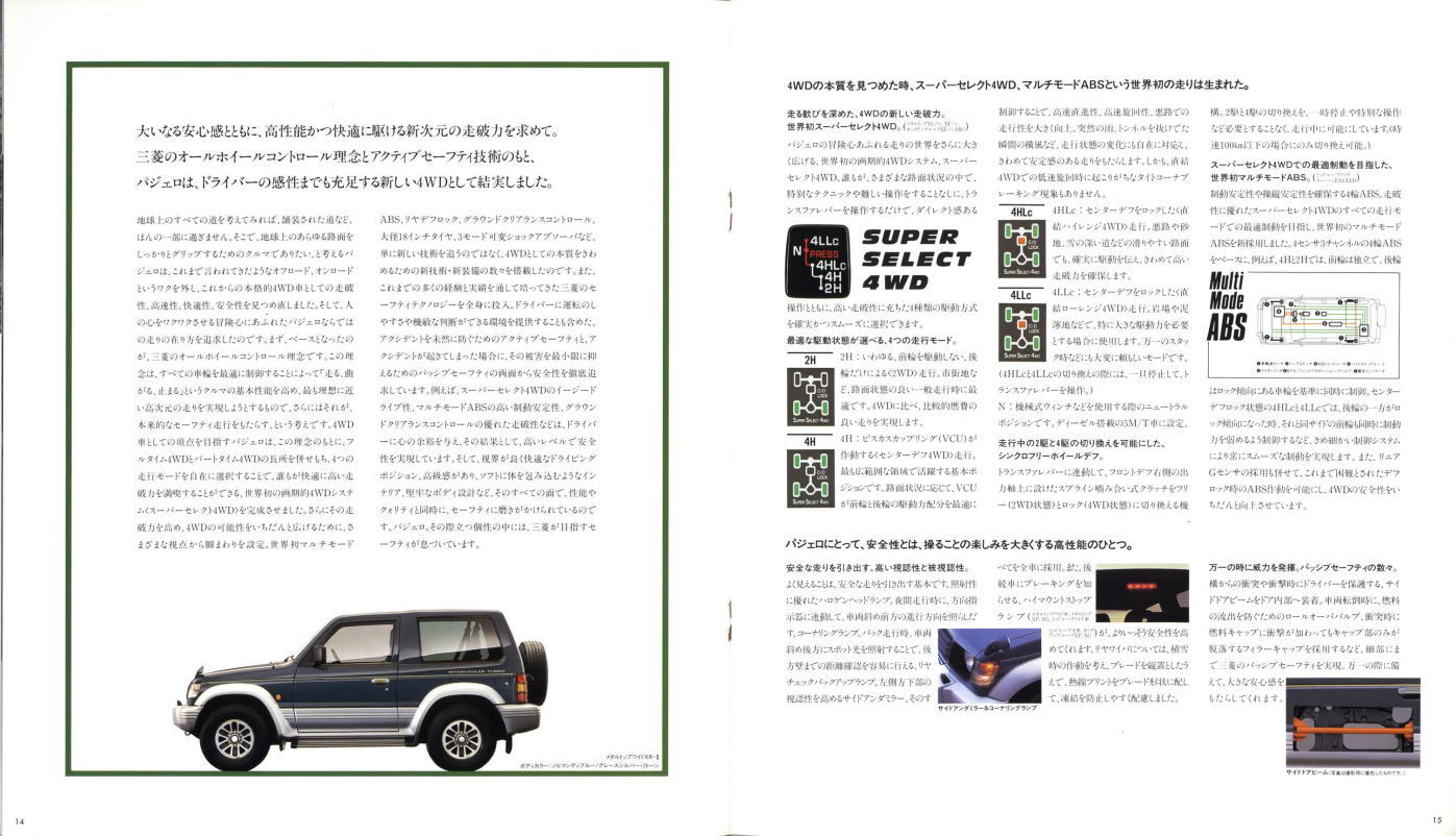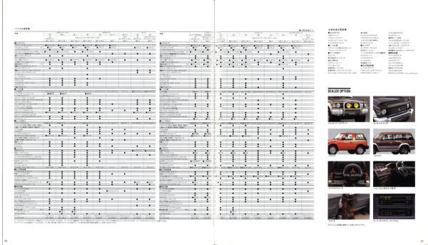 この2代目パジェロ、絶頂期のパジェロだったこともあり、個人的にはやはりパジェロといえば2代目が真っ先に頭に浮かびます。今あらためてこのカタログを見ると、“無骨でごつい男のクルマ”に見えるのですが、当時はこのカタログを見てもハイラックス・サーフ同様、ナンパなクルマにしか見えませんでした。その時々の時代背景によって同じものに対する感じ方もずいぶん変わってくるものですね。ブームに左右されず、現在パジェロを購入されておられる方々は本当のパジェロ・フリークだと思います。冷静に考えれば、この手のクルマが販売台数1位になるなんていうのはちょっと異常なことで、クルマの性質を考えれば現在の比率が自然なんでしょうね。