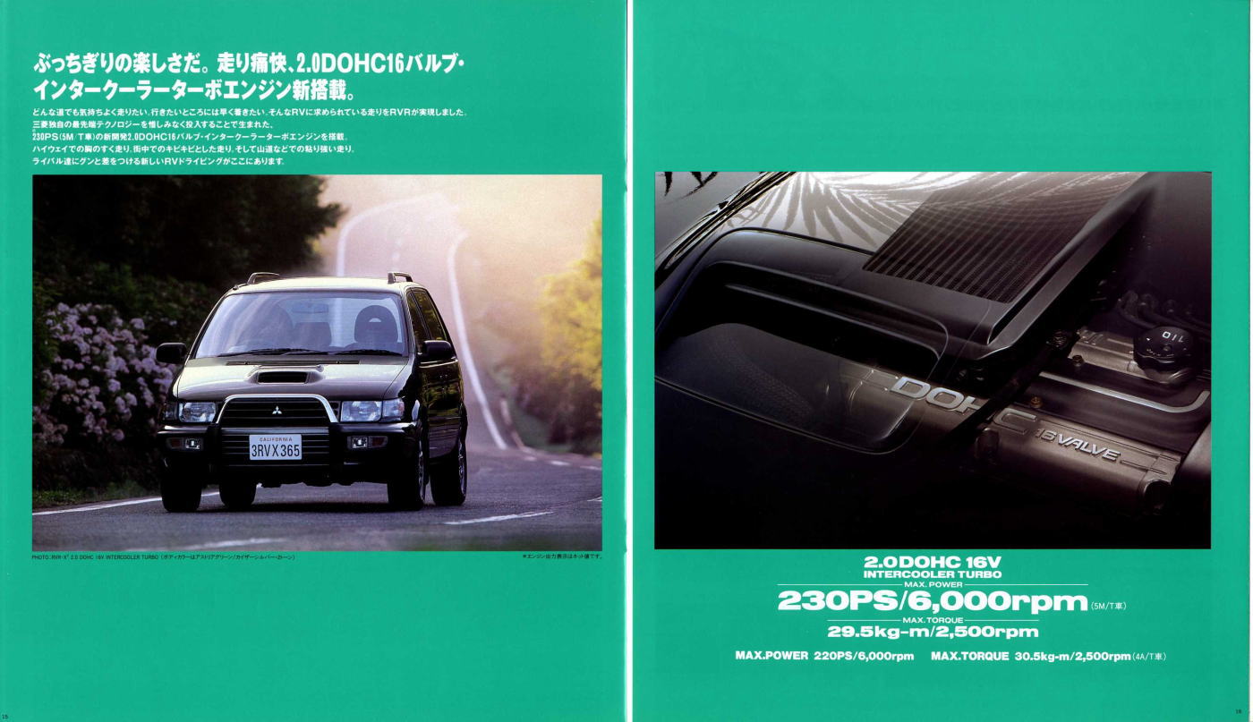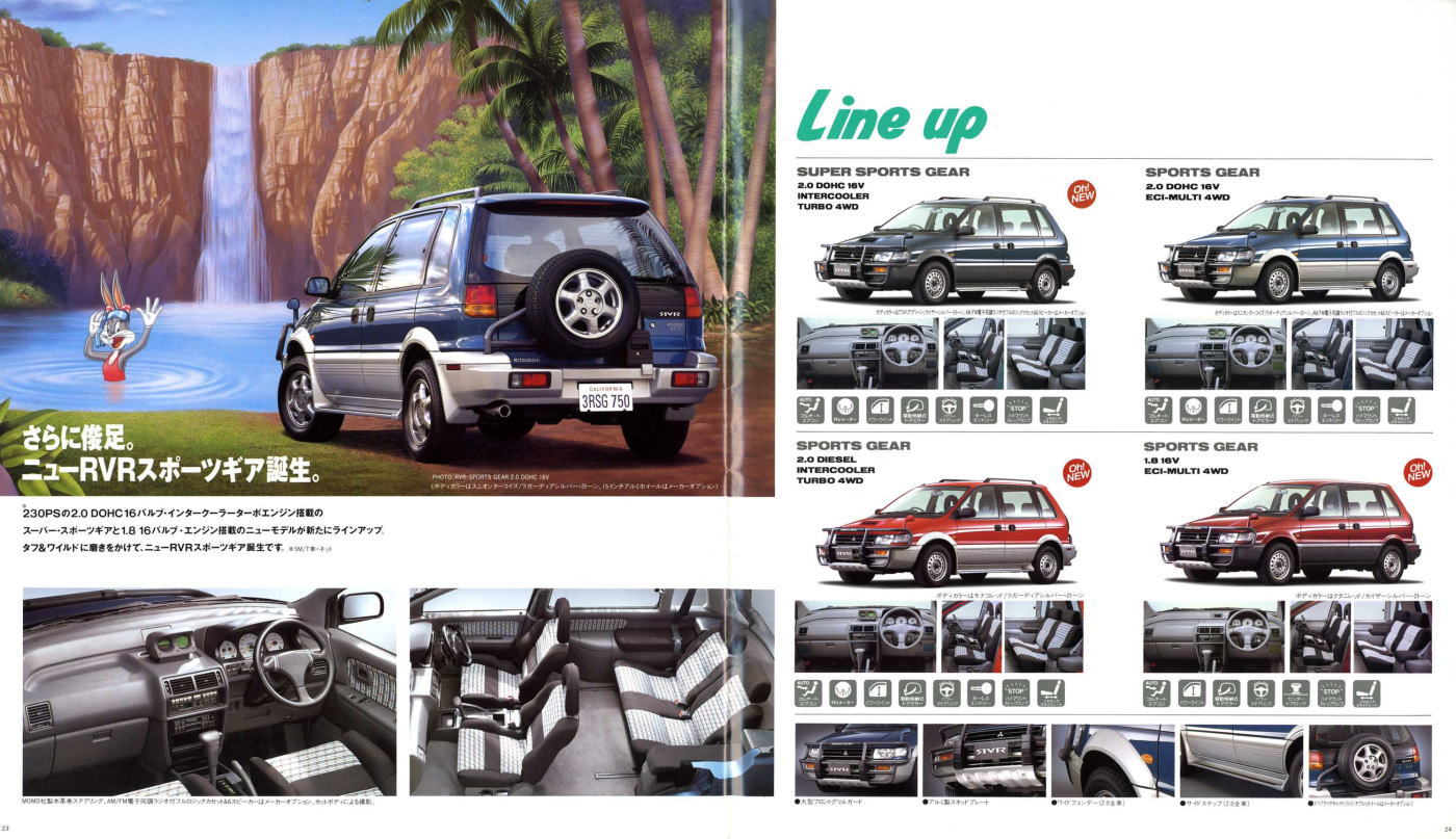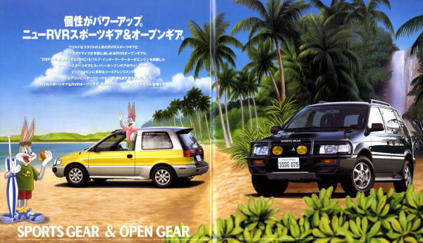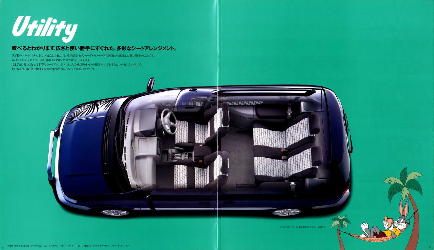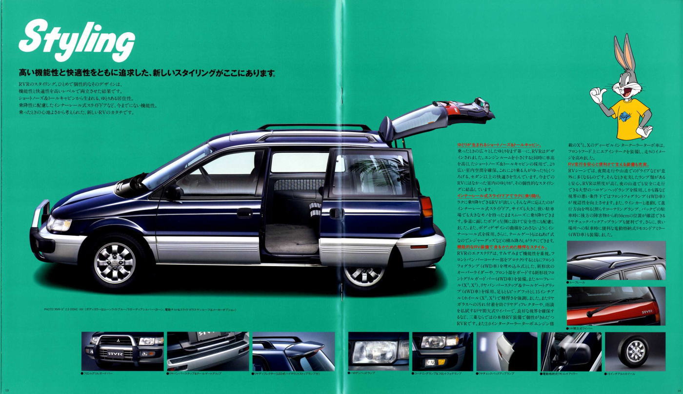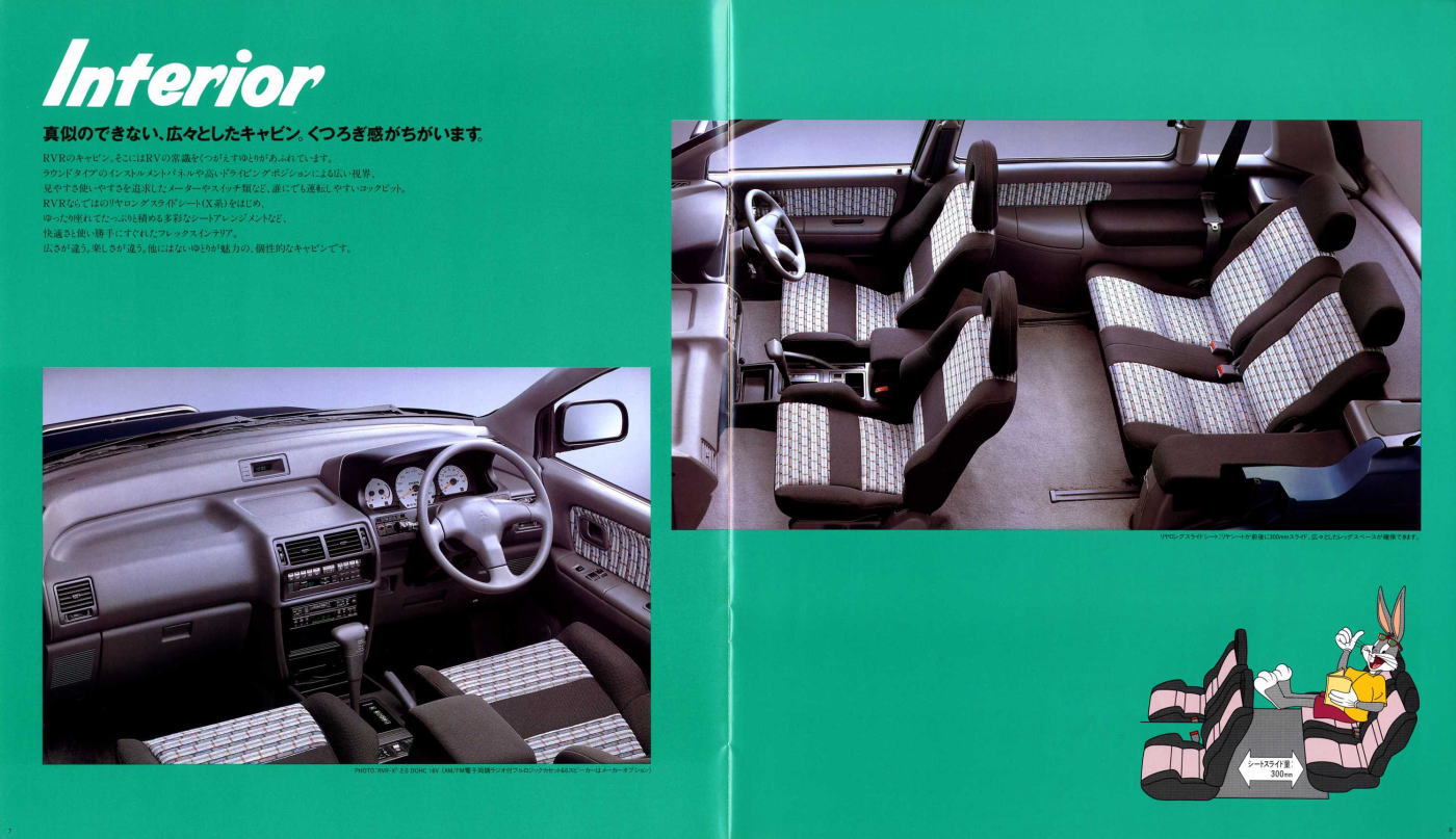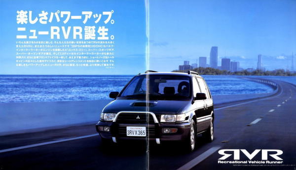 さて、この初代RVR、ご存知の通り、同時期のミニバン・シャリオのショート版で、ミニバンとしてはもっともメインであるセカンドシート部分が省かれていますので、基本的に4人乗りです。当時はRVブームということもあってそこそこ売れていたようですが、今落ち着いて考えてみると、なんとも中途半端なクルマでしたね。とはいえ、このクルマのように無駄の多い遊び心のあるクルマがごく普通に設計されていたというのは、バブル期はやはりメーカー、ユーザーともに心に余裕があったからだと思います。