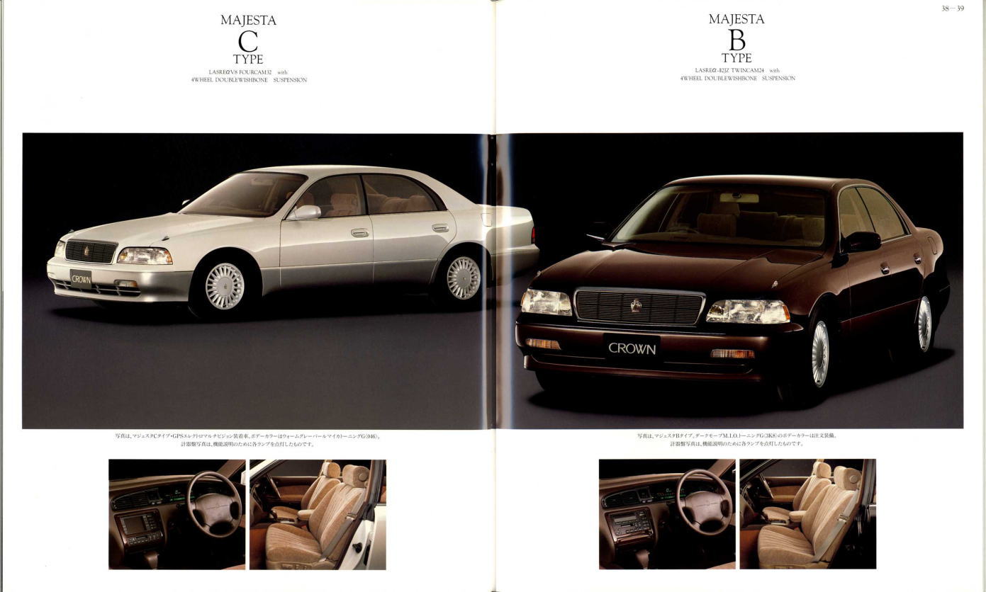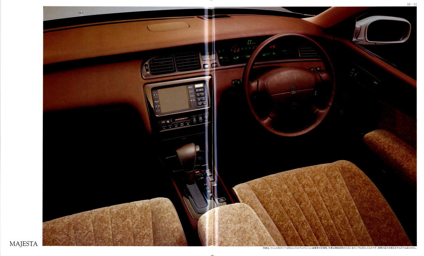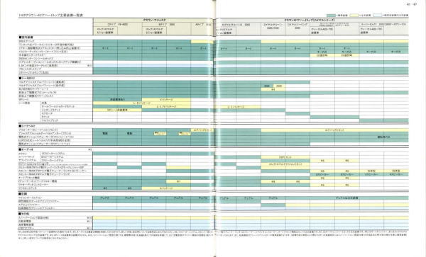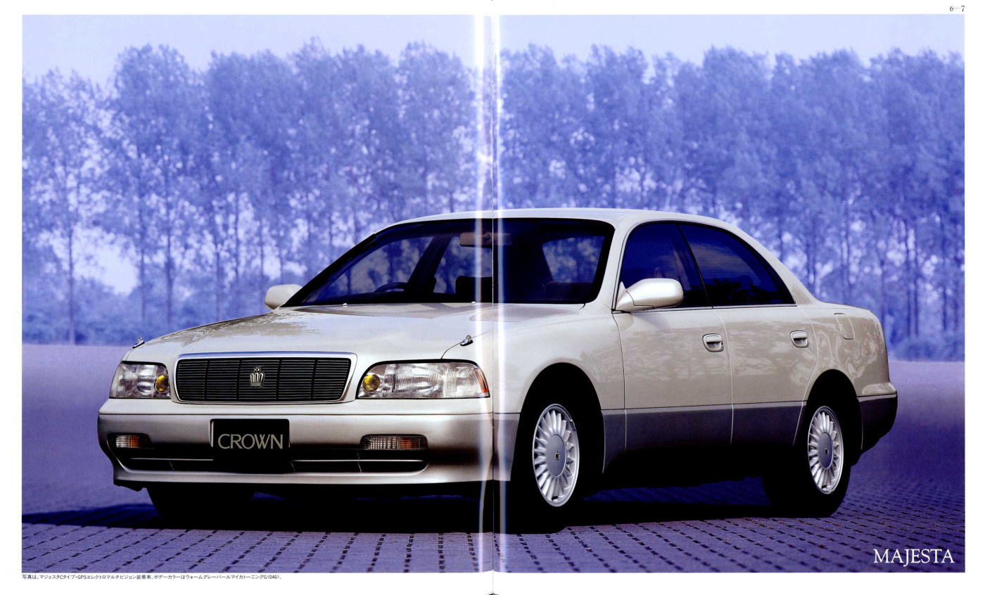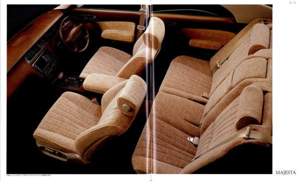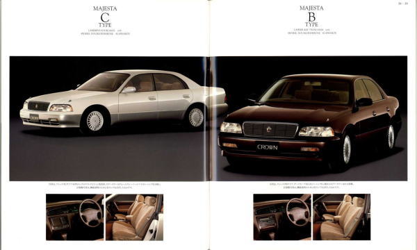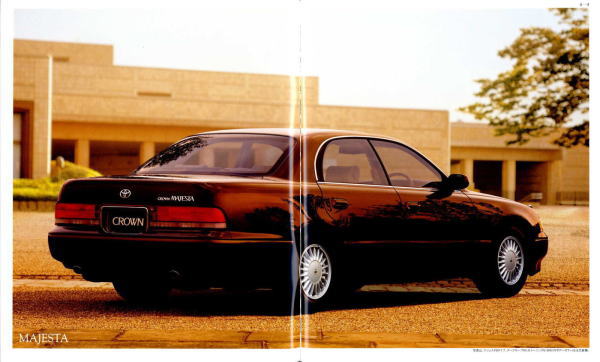 さて、このマジェスタ&クラウン、当時シーマやセルシオのおかげで500万円オーバーという車両価格もそれほど珍しくなくなってきた時期に、「クラウンも500万円コースのクルマだよ」という印象付けをしたという点ではとても意味があるクラウンだったと思います。車体構造の異なるマジェスタとロイヤルシリーズを1冊の「クラウン」のカタログに併記し、さりげなく「クラウン」の名を冠したマジェスタの最上級クラスは600万円オーバーというプライスタグを付けています。当時はまだ私自身の思考回路も「いつかはクラウン」でしたから、まるで一歩近づけば二歩遠ざかってしまう存在のように感じたものでした。