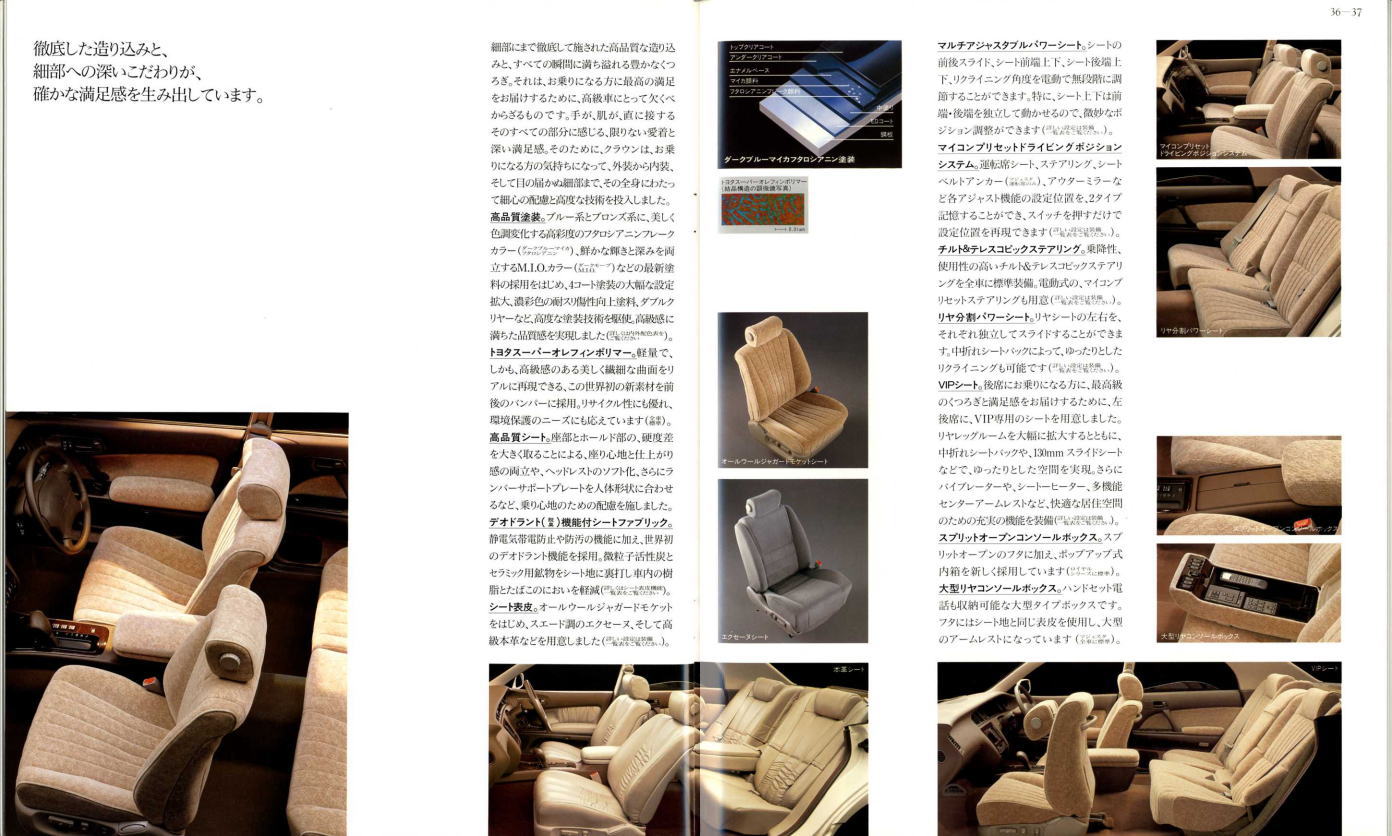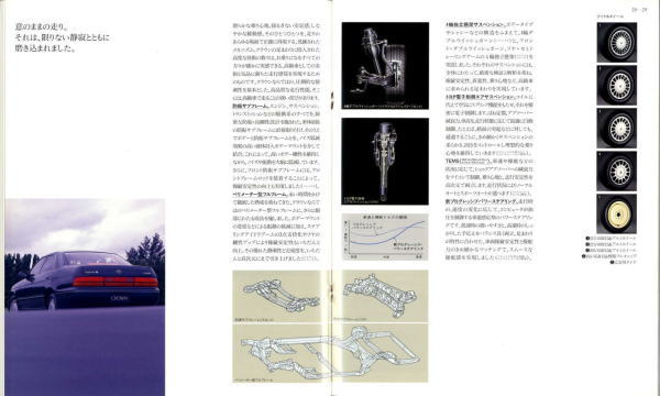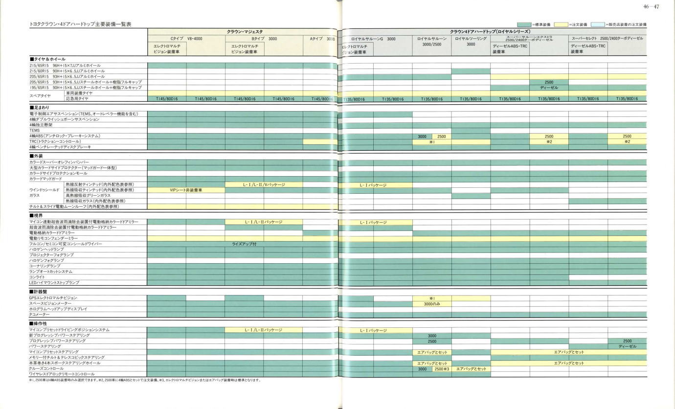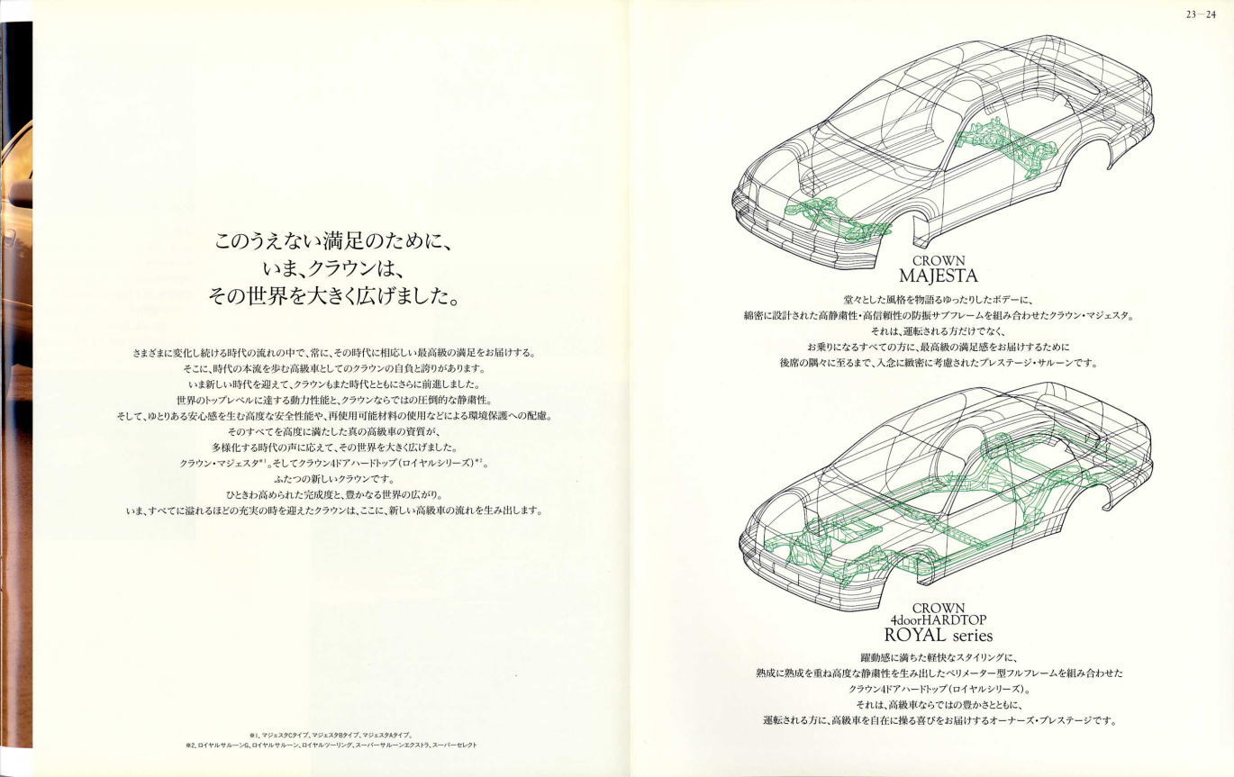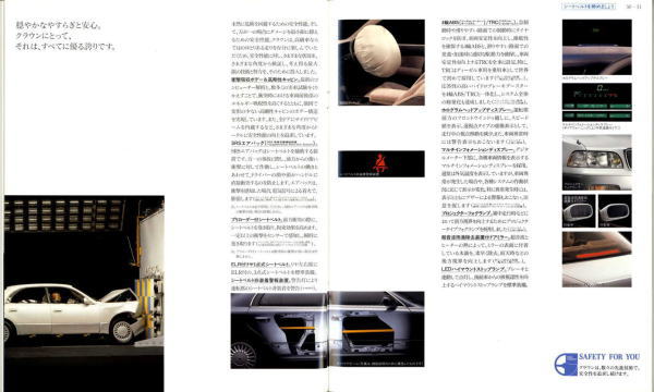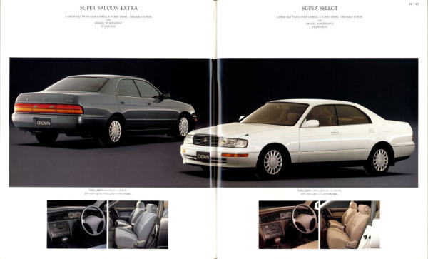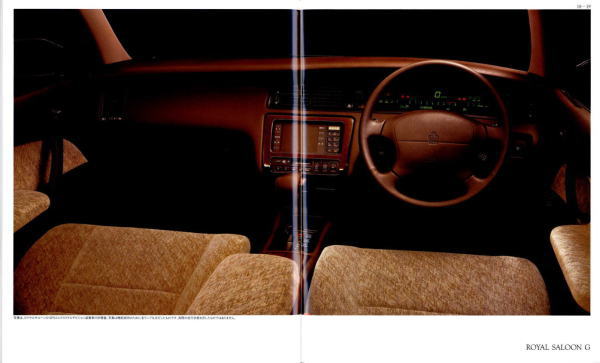 さて、このマジェスタ&クラウン、当時シーマやセルシオのおかげで500万円オーバーという車両価格もそれほど珍しくなくなってきた時期に、「クラウンも500万円コースのクルマだよ」という印象付けをしたという点ではとても意味があるクラウンだったと思います。車体構造の異なるマジェスタとロイヤルシリーズを1冊の「クラウン」のカタログに併記し、さりげなく「クラウン」の名を冠したマジェスタの最上級クラスは600万円オーバーというプライスタグを付けています。当時はまだ私自身の思考回路も「いつかはクラウン」でしたから、まるで一歩近づけば二歩遠ざかってしまう存在のように感じたものでした。