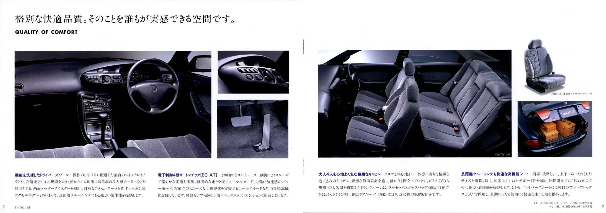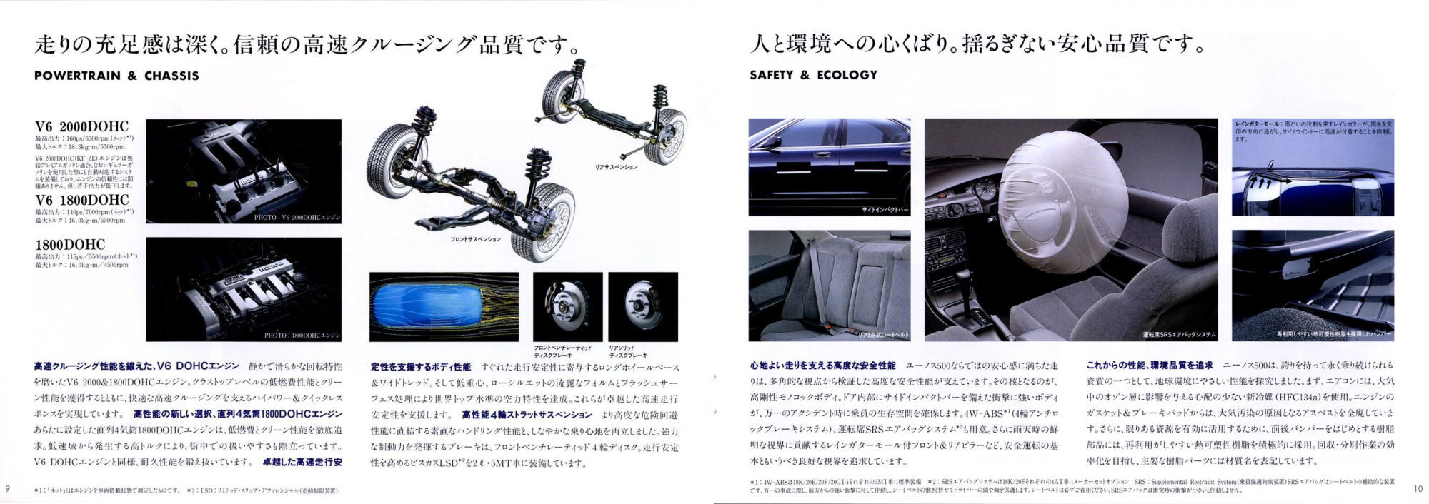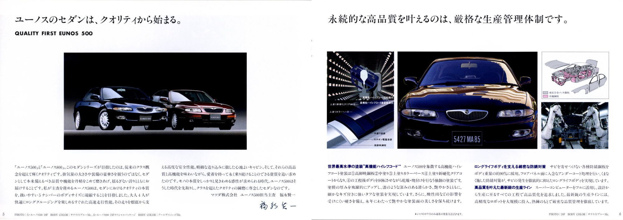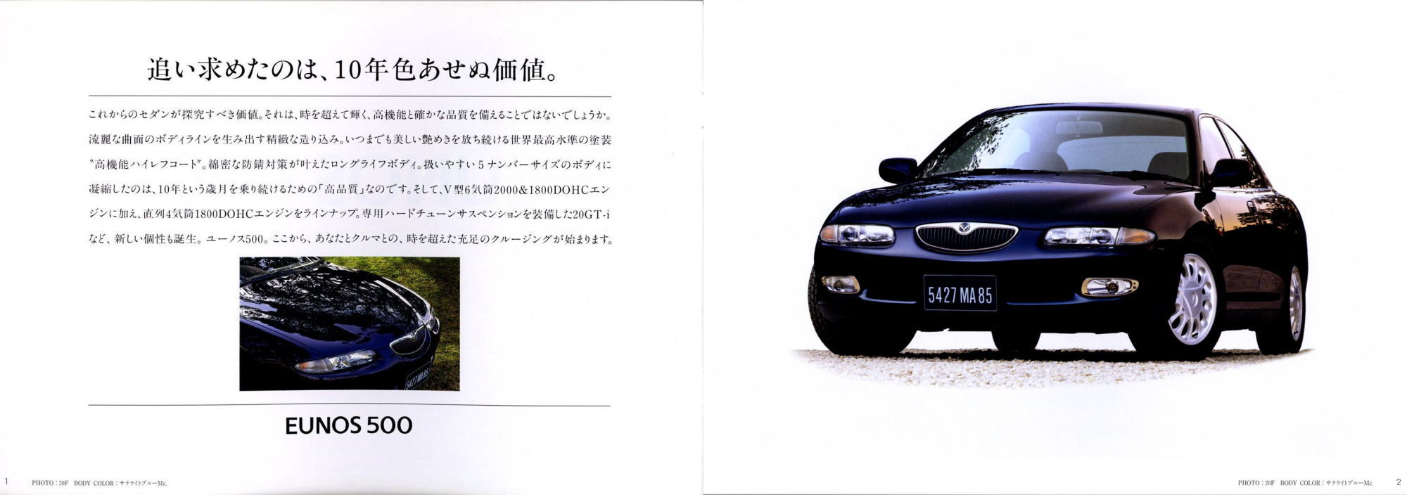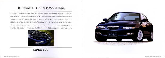さて、このユーノス500、マツダご乱心の時期のクルマなので販売状況も芳しくなく、1代限りで消滅してしまったクルマでしたが、個人的には歴代マツダ車の中では五指に入るほどのカッコいいクルマだと思っています。20年近く前に発売されたクルマとはいえ、現在の感覚で見てもとても素晴らしいデザインで、カタログの“10年色あせぬ価値”という表記にも納得できてしまいます。もっとも、当時はユーノス500が“10年色あせぬ価値”を持ち続けたとしても、果たしてマツダが10年後まで存続しているだろうか、という状況ではありましたが・・・。