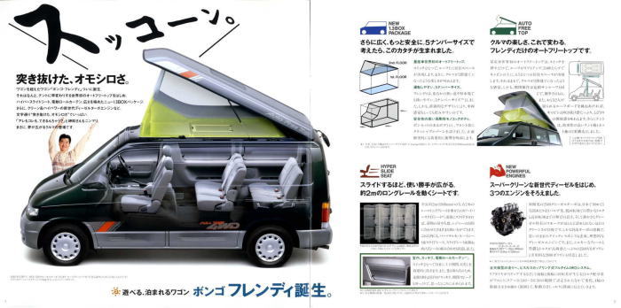 さて、このボンゴフレンディ、やはり最大のセールスポイントは電動で持ち上がるオートフリートップ(AFT)の存在です。AFTを持ち上げれば大人二人が十分に寝られる「二階」ができてしまうという、まるで『ビフォーアフター』で匠がリフォームしたようなクルマですね。AFTが持ち上がった状態のフレンディを見ると、「わずか20秒足らずでキャビンの上にもうひとつの居住スペースが出現します」と言っているサザエさんの声が脳裏に浮かんできてしまいます。