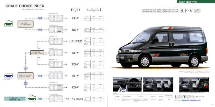 震災後、このような機能が見直されて各社からまた出てくるのかと思っていましたが、なかなかそんな気配はないようですね。それどころか、今はミニバン自体が徐々に落ち目になっているようです。今こそこのカタログの最後のページにあるようなキャンパー仕様で、ルーフにはソーラーパネルを装備してサブバッテリーを充電できるようなクルマがあったらかなり人気(というより、公共施設からの需要)が出そうな気がしますけどね。