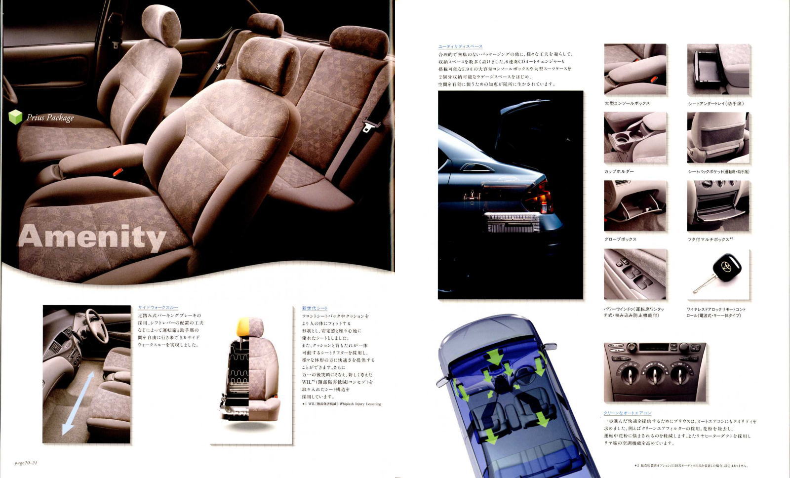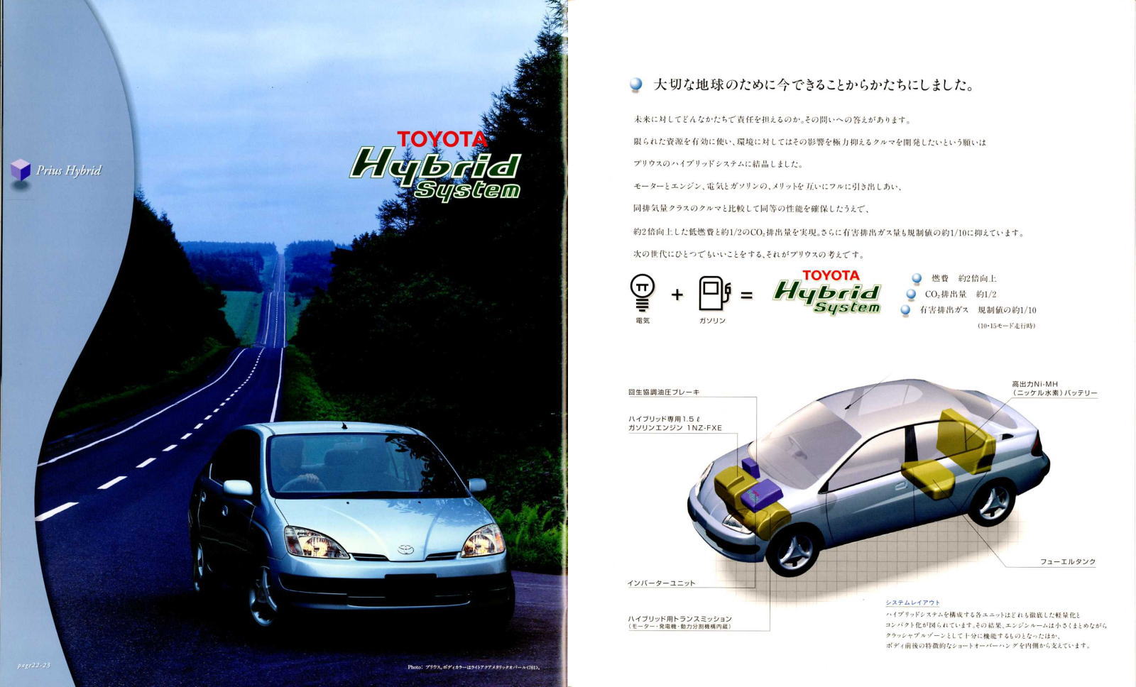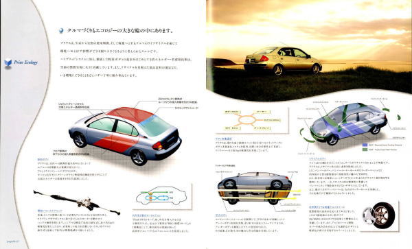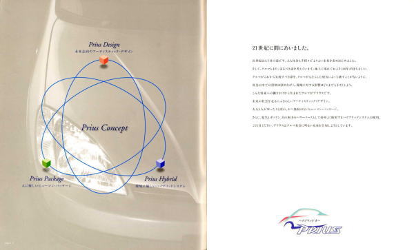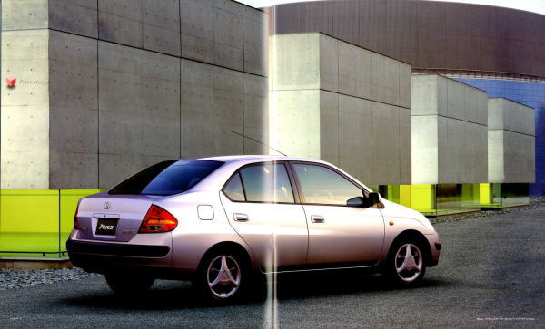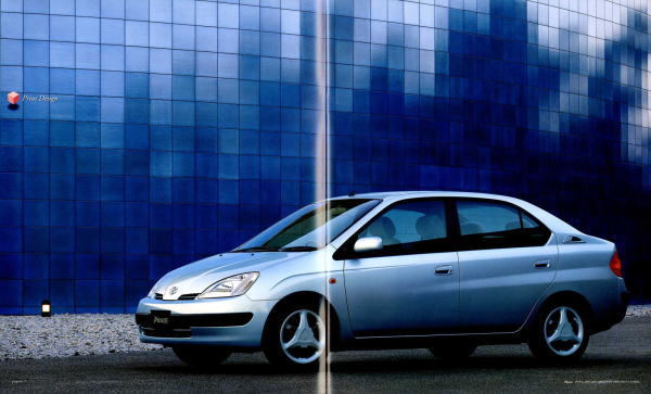 1997年にトヨタから発売された初代プリウス(NHW10型)です。皆様ご存知の通り、世界初の量産ハイブリット車で、構造もスタイルもインテリアも全てが当時の常識とは一線を画した「未来のクルマ」として、「21世紀に間にあいました」。当時、有名なハリウッドスターが自身の環境意識をアピールするためにプリウスを購入していたということでも話題になりましたね。