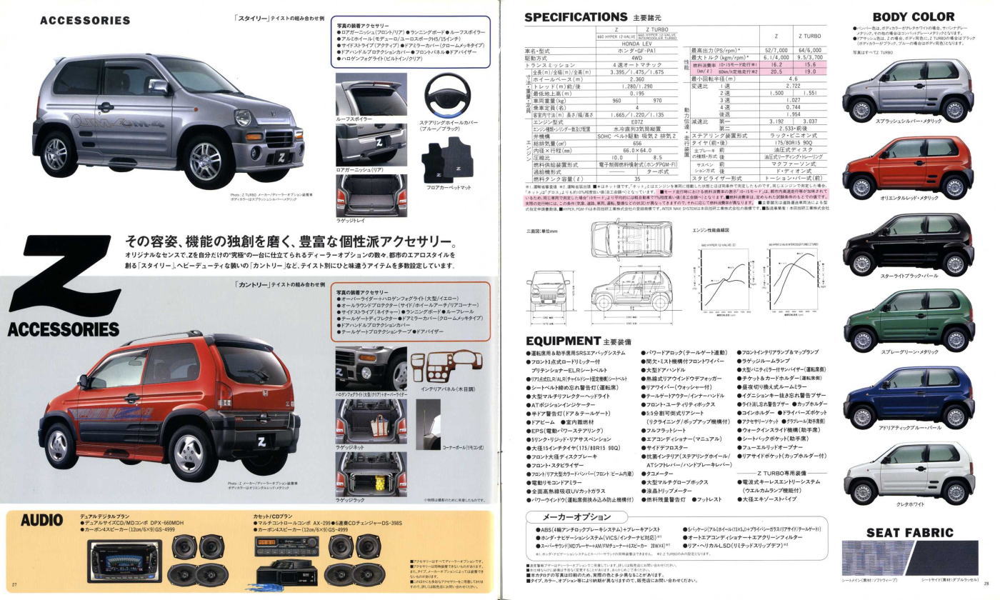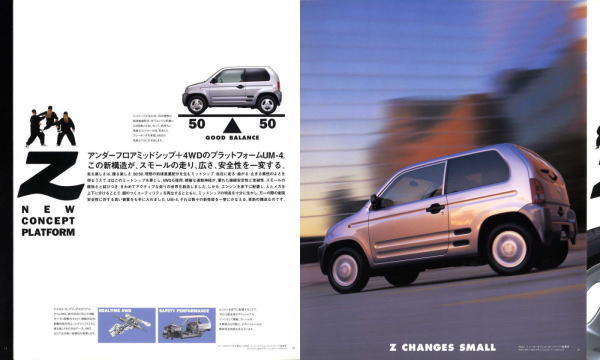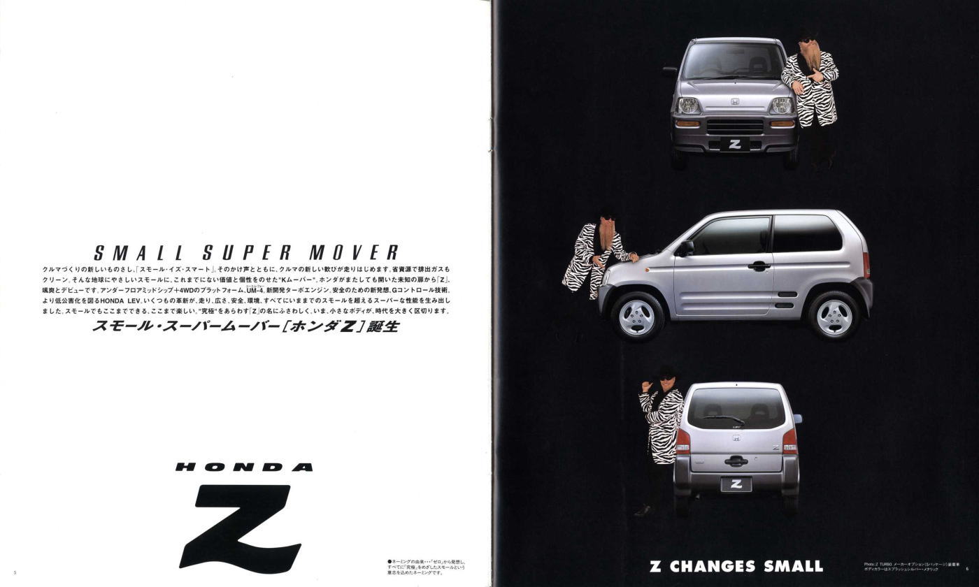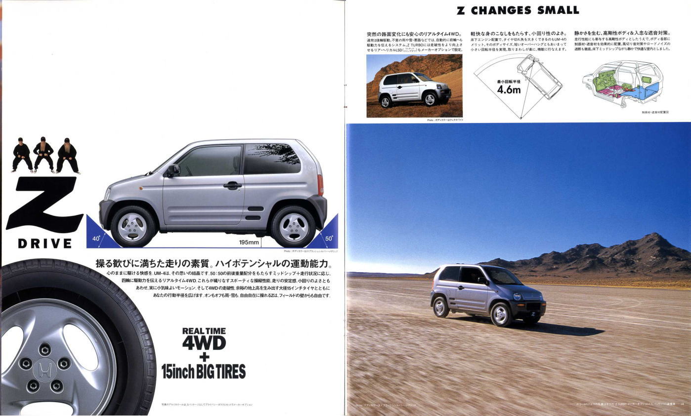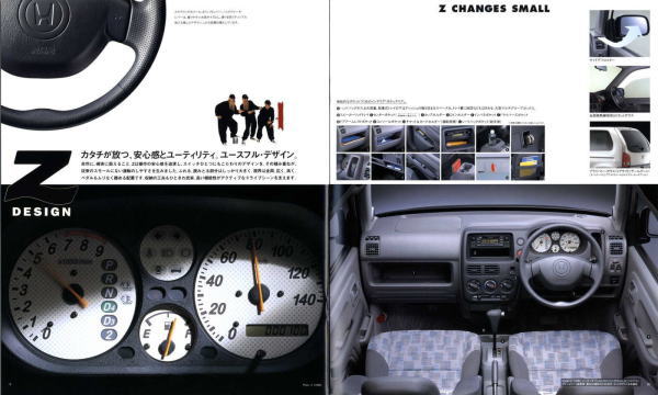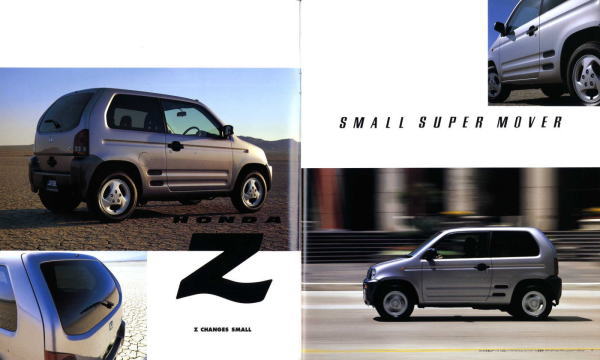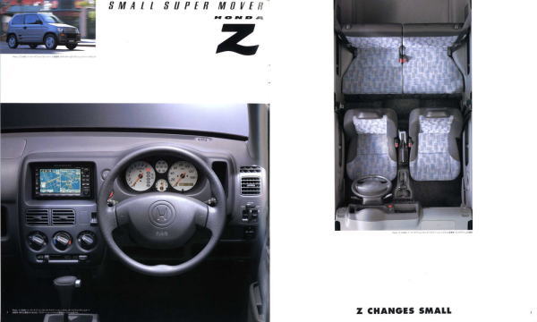 1998年にホンダから発売された2代目Z(PA1型)です。2代目とはいえ、車名が同じということだけで1970年に登場した初代Zとは何の関連もなく、初代の面影もまったくありません。UM-4(UNDERFLOOR MIDSHIP 4WD)と呼ばれる新構造とカタログで大きく紹介されていますが、ホンダの軽トラ・アクティは1983年から同じ構造のミッドシップ4WDを採用していますので、特にこれが新構造というわけではありません。