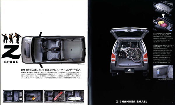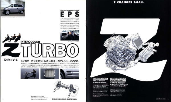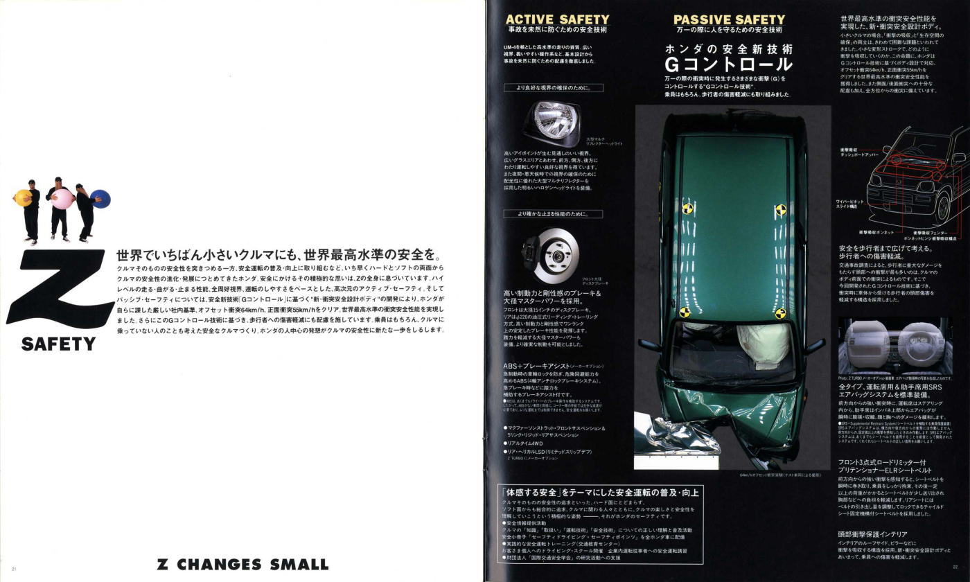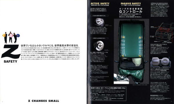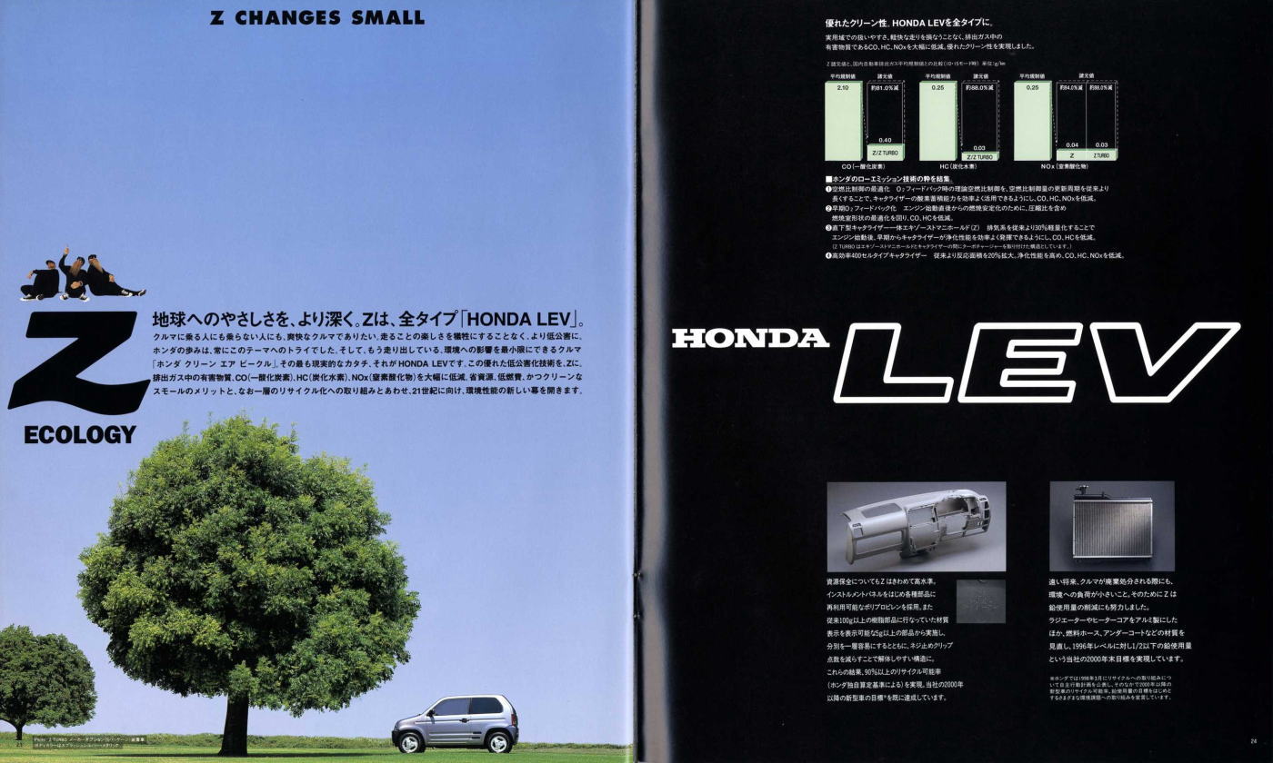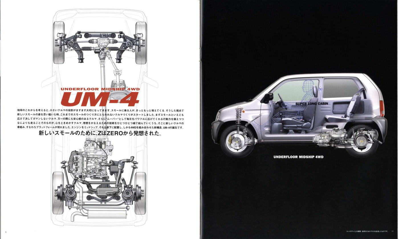 1998年にホンダから発売された2代目Z(PA1型)です。2代目とはいえ、車名が同じということだけで1970年に登場した初代Zとは何の関連もなく、初代の面影もまったくありません。UM-4(UNDERFLOOR MIDSHIP 4WD)と呼ばれる新構造とカタログで大きく紹介されていますが、ホンダの軽トラ・アクティは1983年から同じ構造のミッドシップ4WDを採用していますので、特にこれが新構造というわけではありません。